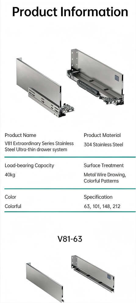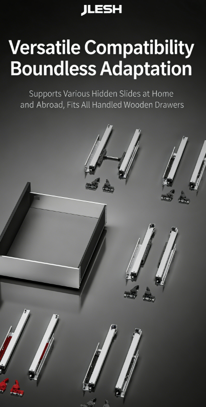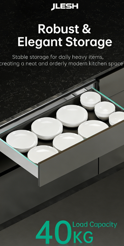 Полное выдвижение направляющих с доводчиком (совместимо со всеми типами направляющих, например, с механизмом открывания нажатием / механизмом открывания нажатием с доводчиком / механизмом открывания нажатием с ручкой).